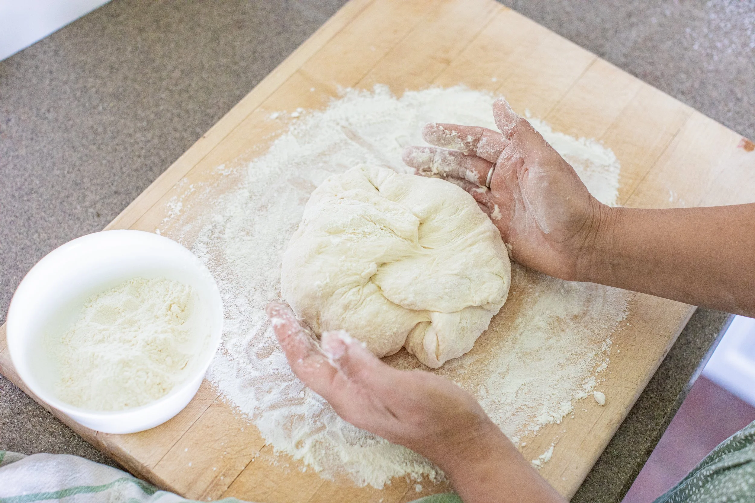 5) Meanwhile, do the shaping and second rise. Take a handful of flour, and sprinkle it on a cutting board so your dough doesn’t stick. Scrape all the dough from the bowl onto the board (keep the bowl - you’ll need it again!). The dough will be sticky. Sprinkle flour on top, take a flap of dough, and fold it over itself, almost like you’re closing an envelope. Keep rotating it and folding it over itself, adding more sprinkles of flour as needed.