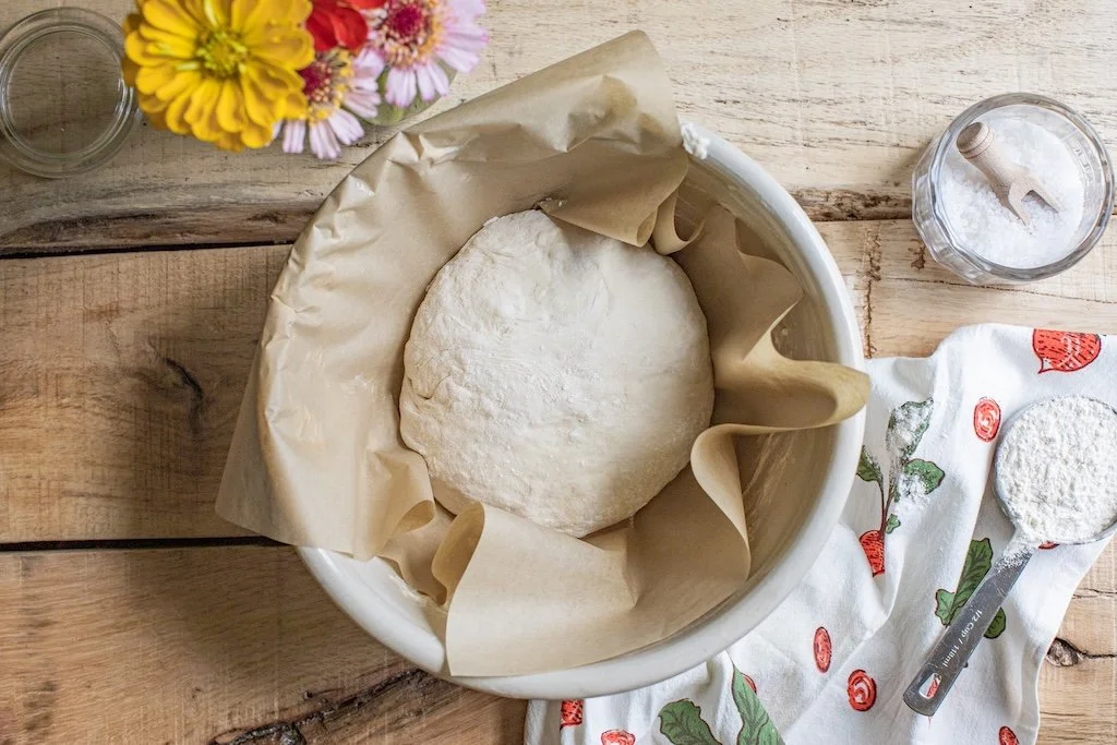 (TIP: if your house is on the colder side, you can set your bowl with the dough in it on the bottom rack inside a cold oven, with just the oven light on. The warmth from the oven light will help it rise. If you do this, put a sticky note on the oven so no one turns it on with your dough inside! Trust me, learned this the hard way. 🫣)